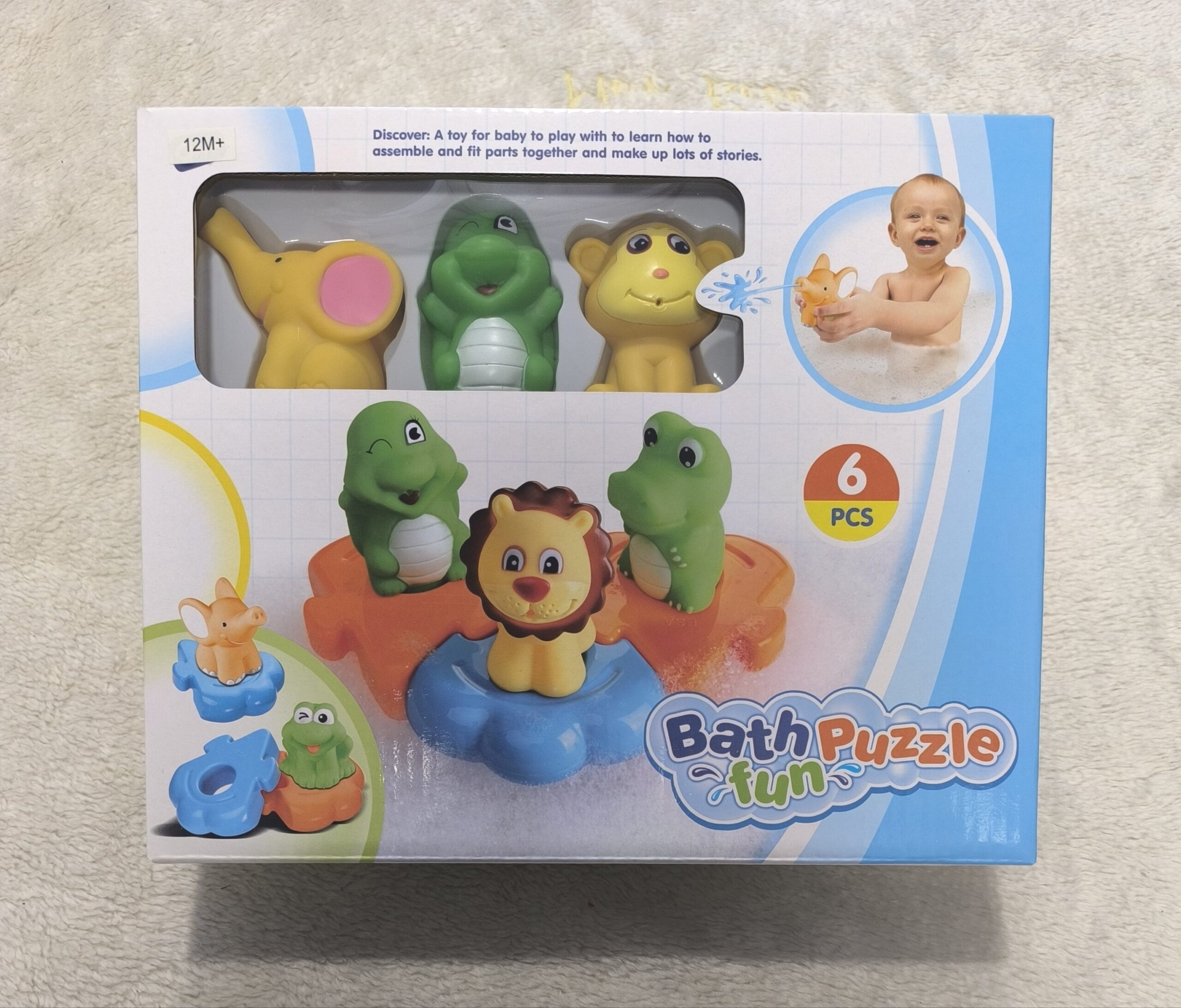 Este es un juego de rompecabezas de animales de goma para el baño con 6 piezas.